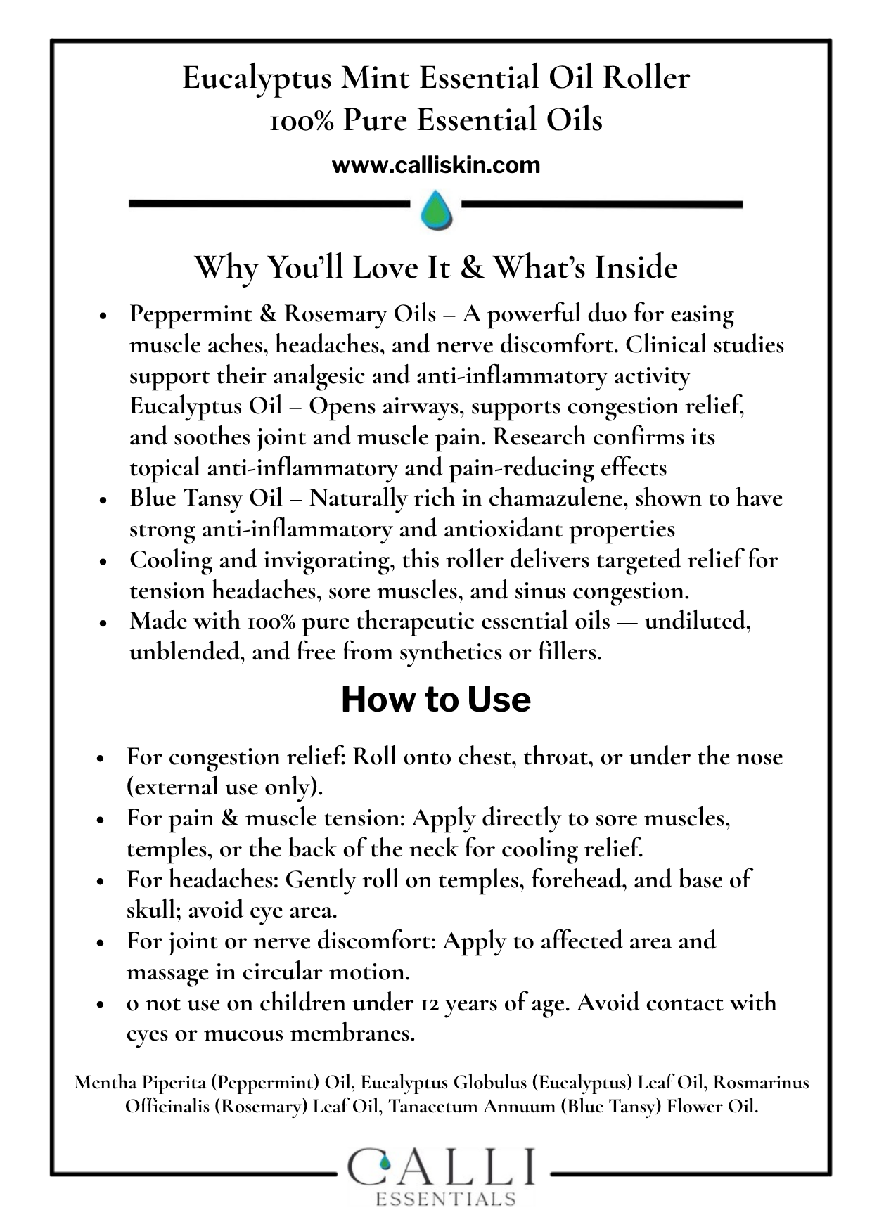 Our Eucalyptus Mint Essential Oil Roller combines four of nature’s most effective botanicals for comfort and relief: peppermint, eucalyptus, rosemary, and blue tansy essential oils — all 100% pure and undiluted (no carrier oil).