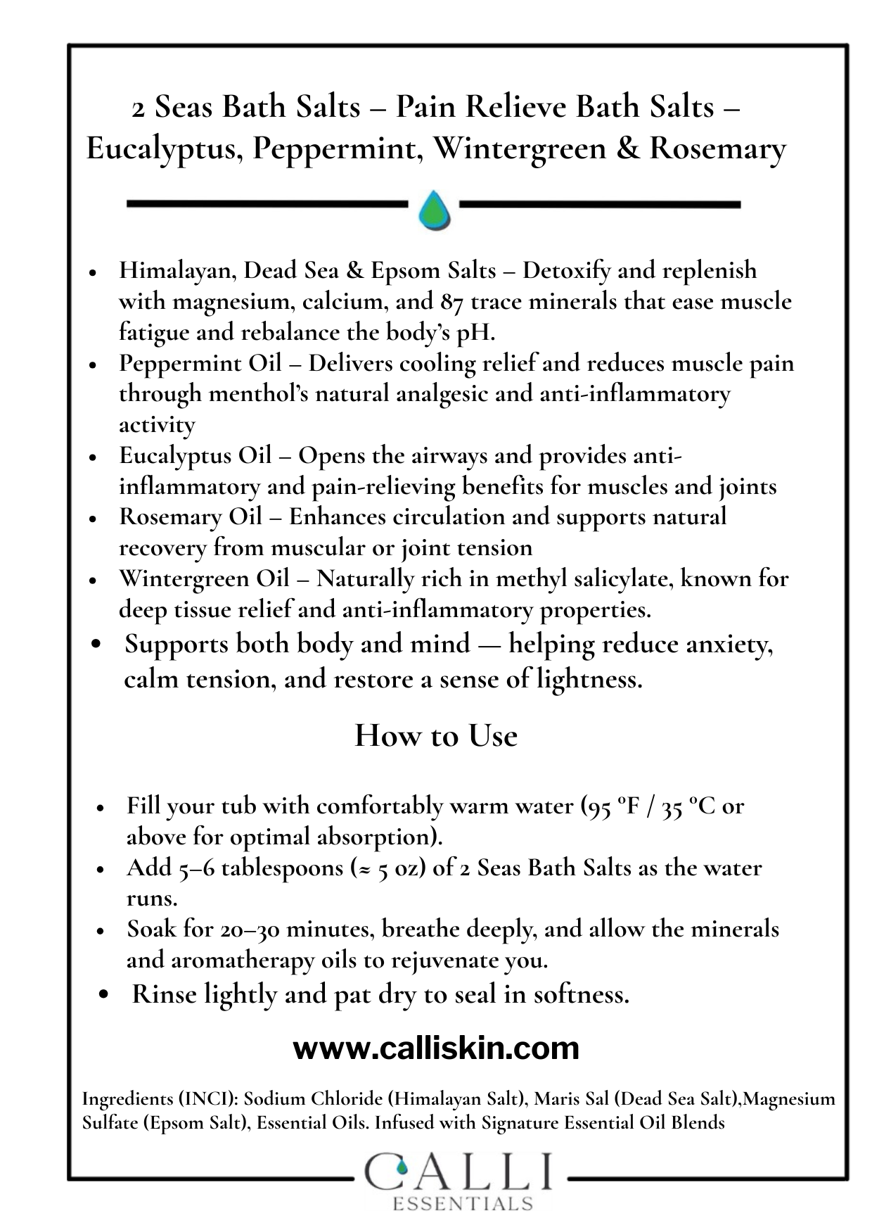Sodium Chloride (Himalayan Pink Salt), Maris Sal (Dead Sea Salt), Magnesium Sulfate (Epsom Salt), Mentha Piperita (Peppermint) Oil, Eucalyptus Globulus (Eucalyptus) Leaf Oil, Rosmarinus Officinalis (Rosemary) Leaf Oil, Gaultheria Procumbens (Wintergreen) Leaf Oil.
