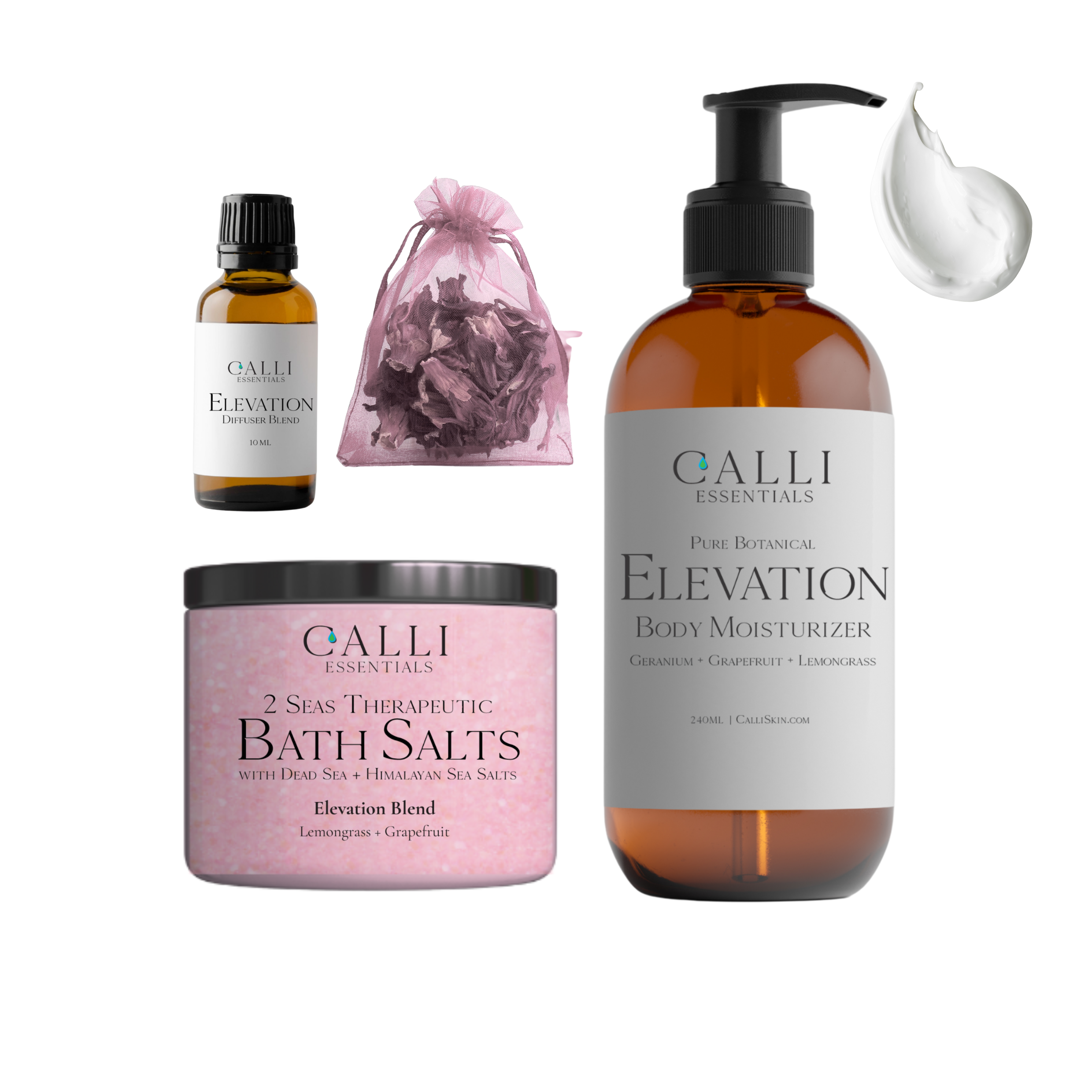 This aromatherapy bath salt gift set includes 2 Seas Essential Oil Bath Salts, a deeply hydrating body moisturizer, and a Pure Therapeutic Essential Oil Concentrate in your choice of Spa, Serenity, or Elevation.